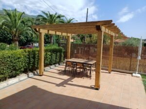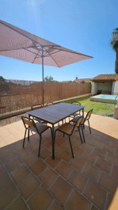 El jardín cuenta con comedor bajo una pérgola, piscina privada con zona de hierba, aseo y un chillout como zona de descanso.